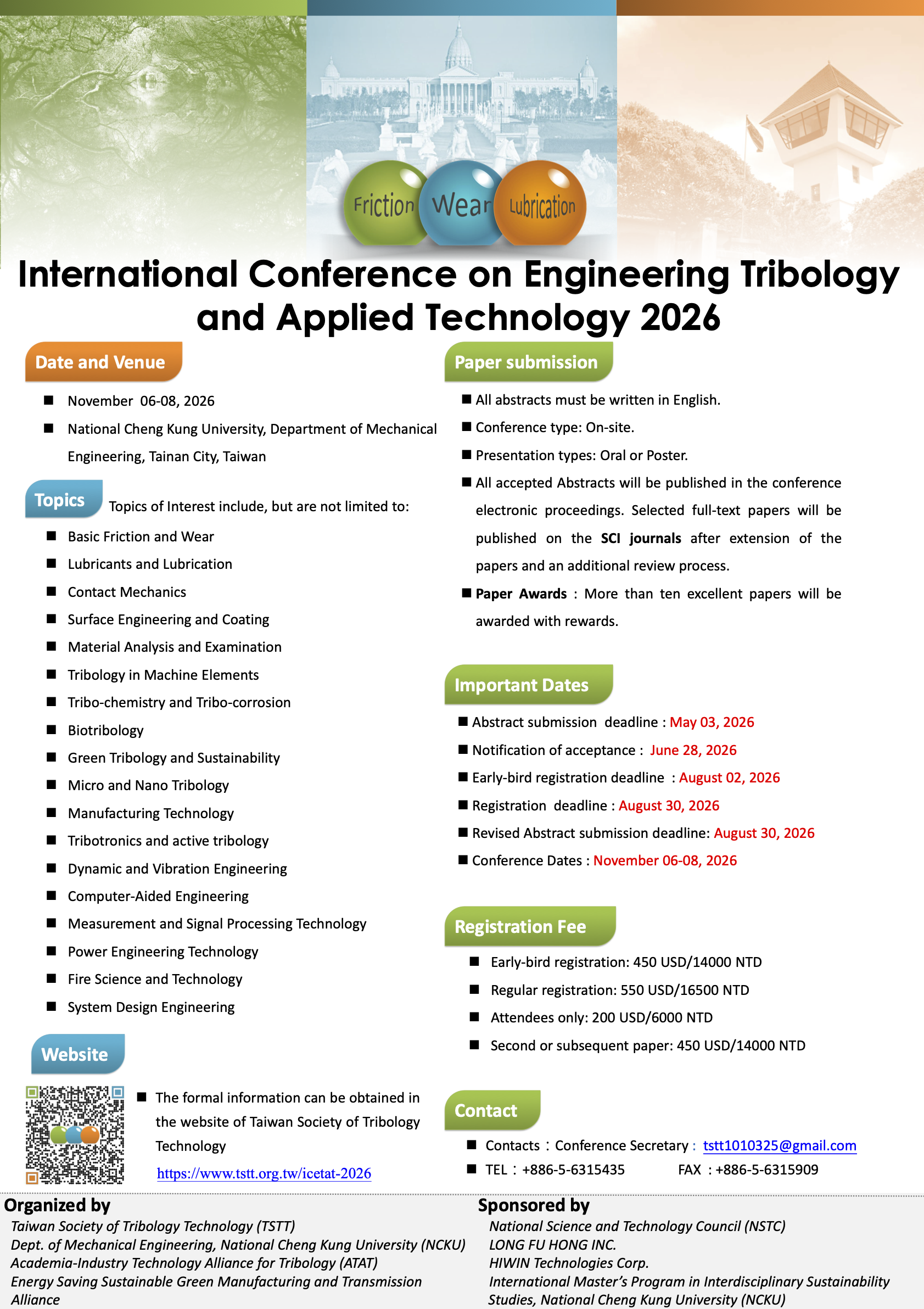 The 2026 International Conference on Engineering Tribology and Applied Technology (ICETAT 2026) will be held on November 06–08, 2026, at the Department of Mechanical Engineering, National Cheng Kung University, Tainan City, Taiwan. For more information, please go to the conference website.
